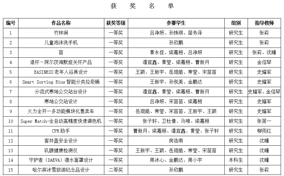 此次大赛,共有来自哈尔滨工业大学、哈尔滨工程大学、77779193永利官网、东北林业大学、东北石油大学等省内多所高校参加。虽在新冠疫情期间,但是依然得到学校研究生部、教务处和机械动力工程学院领导们的大力支持,并在永利官网工业设计系主任张莉教授的指导和全系师生的共同努力下,全体师生克服重重困难积极参加此次大赛。永利官网工业设计专业研究生和本科生一共提交52份作品。经大赛组委会组织专家初评、终评和大赛评审指导委员会综合审定,工业设计系研究生在此次大赛中取得了优异的成绩,在提交的44件作品中,有30项作品获得各种奖项。其中大赛35项一等奖中永利官网研究生作品获得其中13项。除此外还获得二等奖9项,三等奖8项;本科生提交8项作品,其中6项作品分别获得一等奖1项、二等奖2项,三等奖3项的好成绩。通过比赛使工业设计系全体师生在实践中不断成长,各方面的能力陆续得到提升,凸显了永利官网工业设计专业优秀的教学成果和突出的实力。