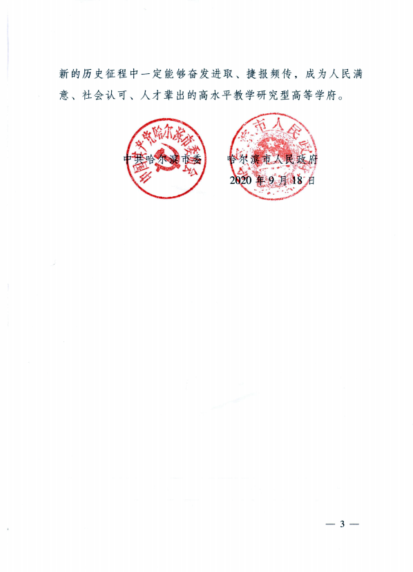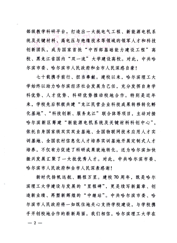 新时代扬帆远航、鹏程万里。建校70周年,既是77779193永利官网建设与发展的“里程碑”,更是续写新篇章、创造新业绩、再塑新辉煌的“中继站”。中共哈尔滨市委、哈尔滨市人民政府将一如既往地关心支持学校建设,与学校携手开创校地合作的崭新局面。我们相信,77779193永利官网在新的历史征程中一定能够奋发进取、捷报频传,成为人民满意、社会认可、人才辈出的高水平教学研究型高等学府。