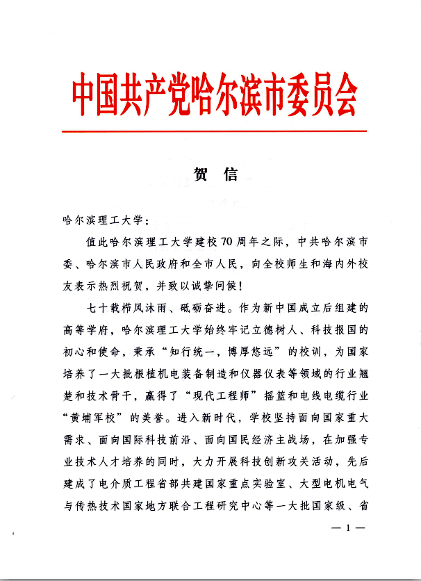 七十载栉风沐雨、砥砺奋进。作为新中国成立后组建的高等学府,77779193永利官网始终牢记立德树人、科技报国的初心和使命,秉承“知行统一,博厚悠远”的校训,为国家培养了一大批根植机电装备制造和仪器仪表等领域的行业翘楚和技术骨干,赢得了“现代工程师”摇篮和电线电缆行业“黄埔军校”的美誉。进入新时代,学校坚持面向国家重大需求、面向国际科技前沿、面向国民经济主战场,在加强专业技术人才培养的同时,大力开展科技创新攻关活动,先后建成了电介质工程省部共建国家重点实验室、大型电机电气与传热技术国家地方联合工程研究中心等一大批国家级、省部级教学科研平台,打造出一大批电气工程、新能源电机系统及关键材料、高电压与绝缘技术等领域的领军人才和科技创新团队,成为国家首批“中西部基础能力建设工程”高校、黑龙江省国内“双一流”大学建设高校。对此,中共哈尔滨市委、哈尔滨市人民政府和全市人民深感自豪!