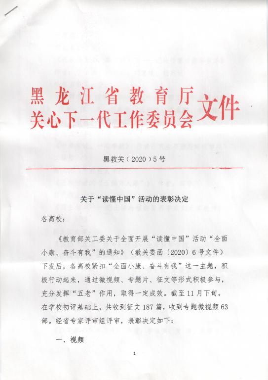 教育部关工委自2018年推出“读懂中国”活动以来,永利官网关工委已开展活动二年了,去年有二项作品获奖,今年又有五项作品获奖。此项活动受到广大青年学生、“五老”和学校的广泛欢迎,并积极参与,现在逐步成为永利官网关工委助力学生思想政治工作渠道,成为思想政治教育的有效品牌,今年九月根据省关工委《关于开展“读懂中国”活动“全面小康,奋斗有我”的通知》精神,校关工委在青年学生中开展以“全面小康,奋斗有我”为主题的“读懂中国”活动。