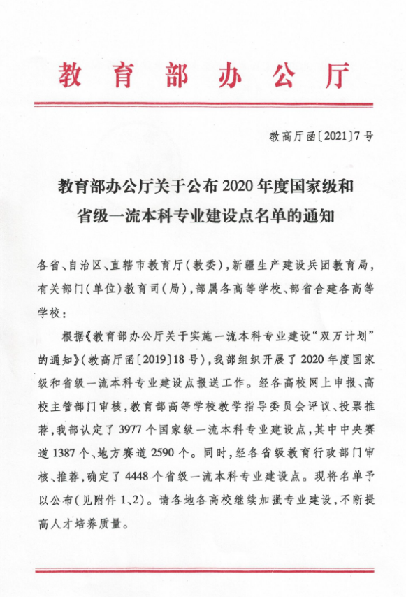 教育部办公厅公布2020年度国家级和省级一流本科专业建设点名单
