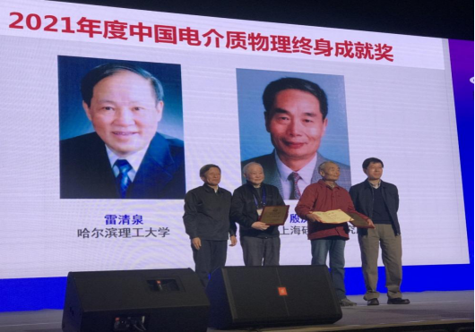 会上,中国物理学会电介质物理专业委员会举行了颁奖仪式,永利官网雷清泉院士喜获“2021年度中国电介质物理终身成就奖“,大会特邀嘉宾、西安交通大学校长王树国为雷清泉院士颁奖。