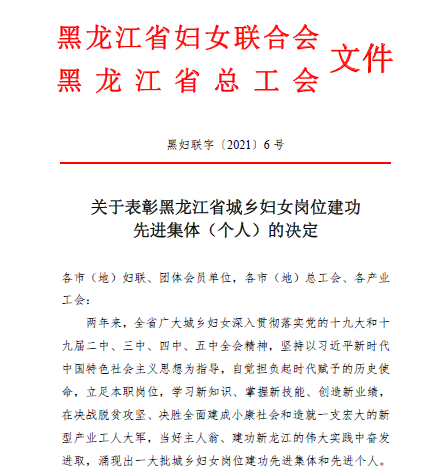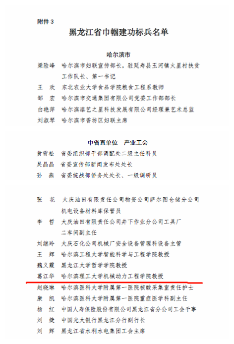 日前,黑龙江省妇女联合会、省总工会决定,表彰近两年来全省妇女职工深入贯彻落实党的十九大和十九届二中、三中、四中、五中全会精神,坚持以习近平新时代中国特色社会主义思想为指导,自觉担负起时代赋予的历史使命,立足本职岗位,学习新知识、掌握新技能、创造新业绩,在决战脱贫攻坚、决胜全面建成小康社会和造就一支宏大的新型产业工人大军,当好主人翁、建功新龙江的伟大实践中奋发进取,涌现出的妇女岗位建功先进集体和先进个人。永利官网机械动力工程学院葛江华教授被授予“黑龙江省巾帼建功标兵”荣誉称号。