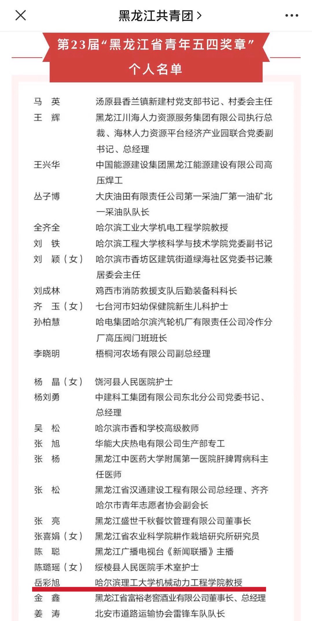 为集中展示新时代龙江青年的精神品格和价值追求,引导我省广大青年担当作为,激励广大青年坚守信念,积极投身全面建设社会主义现代化国家新征程,不负时代,担当作为,建功立业,以优异成绩献礼建党100周年。经第23届“黑龙江省青年五四奖章”评审会议评审、团省委书记会议研究,团省委、省青联决定,授予30名同志第23届“黑龙江省青年五四奖章”,授予11个青年集体第23届“黑龙江省青年五四奖章集体”。其中永利官网机械动力工程学院岳彩旭教授荣获第23届“黑龙江省青年五四奖章”荣誉称号!