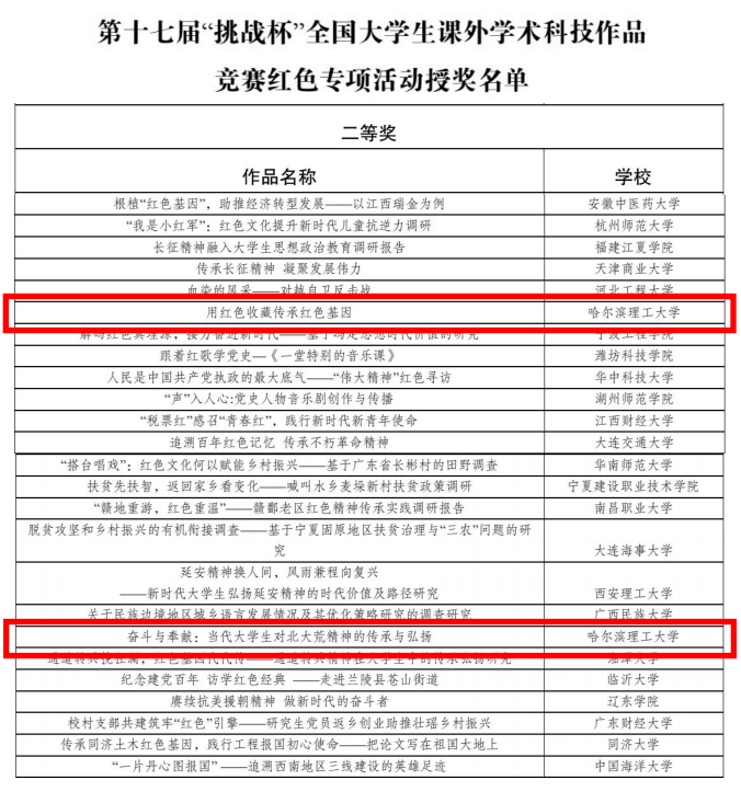 据悉,今年1月启动的“挑战杯”红色专项活动是第十七届“挑战杯”竞赛组委会结合庆祝中国共产党成立100周年主题新增的专项赛,大赛以“传承红色基因,践行初心使命”为主题,旨在通过红色主题社会实践活动,引领青年学生感受党的百年光辉历程和伟大成就,努力成长为担当民族复兴大任的时代新人,吸引了全国高校广大青年学生的踊跃参与,形成了数十万件实践成果,其中17000多件作品报名参赛。经过广泛发动,永利官网共派出56支团队,近300余名哈理工学子参与其中,全力贯彻红色精神传承中的学思践悟,传承“红色根脉”,让永利官网青年学生在党史学习教育中培育红色理念,在实践中感悟初心使命,让红色星火在一代代青年中传递。