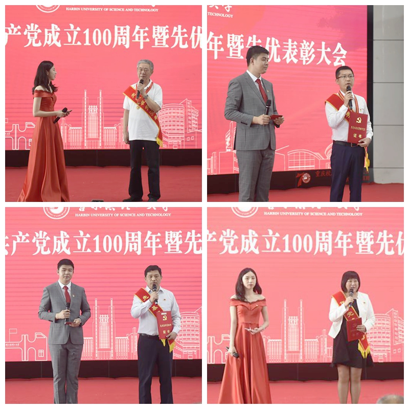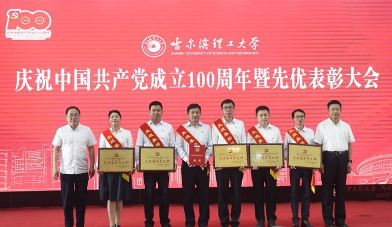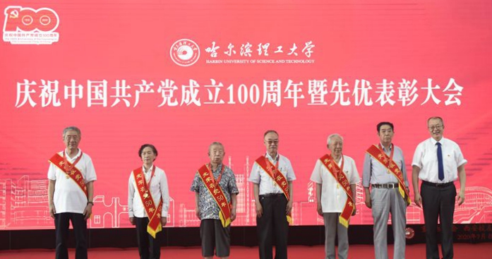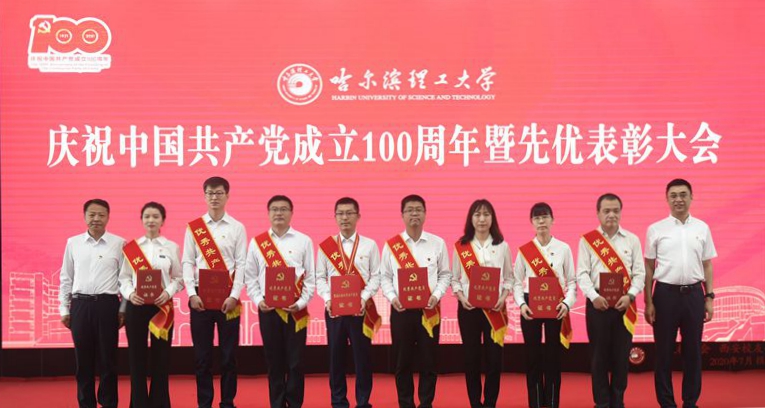 首先由陆岩副书记宣读获奖名单。胡军同志获黑龙江省“优秀共产党员”荣誉称号,陈明华、张凤鸣、武建龙、李东洁、邹芸潞5位同志获省委教育工委“优秀共产党员”荣誉称号,李新灵、艾荻、乔林3位同志获省委教育工委“优秀党务工作者”荣誉称号,材料科学与化学工程学院金属材料工程系党支部、电气与电子工程学院电气绝缘与电缆党支部、机械动力工程学院机械工程实验中心党支部获省委教育工委“先进基层党组织”荣誉称号。陆岩宣读《77779193永利官网2019-2021年度“两优一先”表彰的决定》,对吴石等56名优秀共产党员、戴湘竹等6名优秀党务工作者、机械设计及其自动化系党支部等6个党组织 “先进基层党组织”进行表彰,学校党委书记、校长赵琳及全体校领导为受表彰代表颁奖,同时为老党员代表颁发“光荣在党50年”纪念章,全场响起一阵阵热烈的掌声。