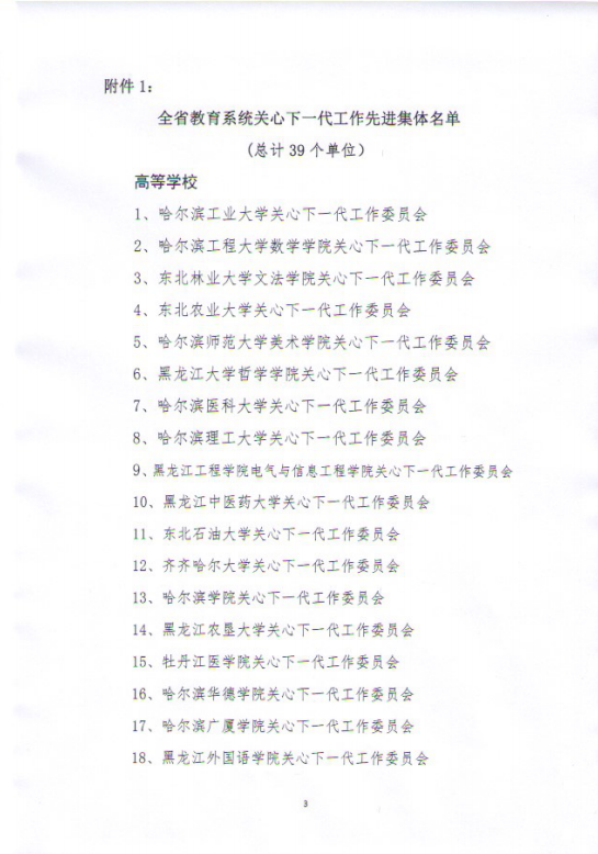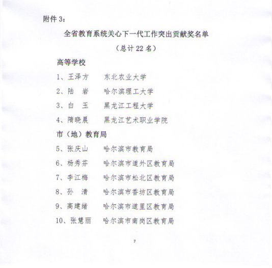 近日,黑龙江省教育厅关心下一代工作委员会印发《关于表彰全省教育系统关心下一代工作先进集体和先进工作者的通报》黑教关【2021】5号,永利官网关工委荣获“全省教育系统关心下一代工作先进集体”荣誉称号、党委副书记陆岩同志荣获“全省教育系统关心下一代工作突出贡献奖”、邓彩霞同志荣获“全省教育系统关心下一代工作先进工作者”。