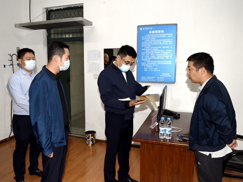 为落实上级有关中秋节、国庆节期间安全工作提示的有关要求,结合校园安全工作实际,9月17日下午,校长刘侠带队深入西、南两校区的宿舍、食堂、浴池、校医院、心理咨询中心、变电所、水源地、新主楼消防控制室、总值班室、楼体外墙施工及相关维修工地等多个场所就校园安全工作开展专项督导检查。刘侠强调,各单位要提高站位,强化安全忧患意识,严格落实节假日期间的三级值班制度,明确各级安全岗位职责,做好师生安全教育管理,常态化开展风险排查,消除安全隐患,确保校园安全稳定。