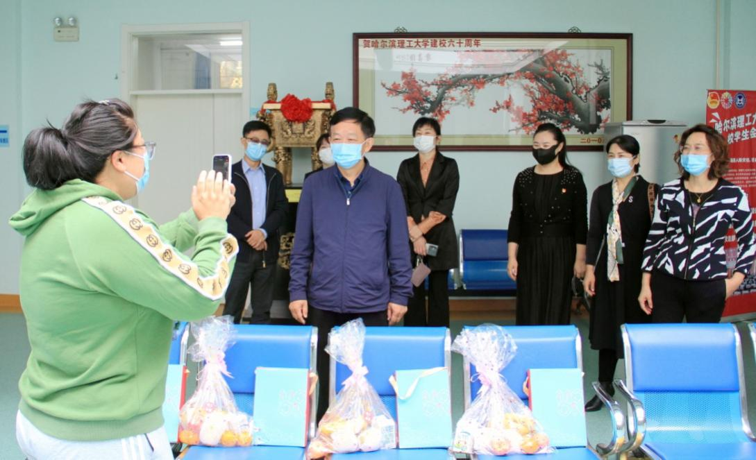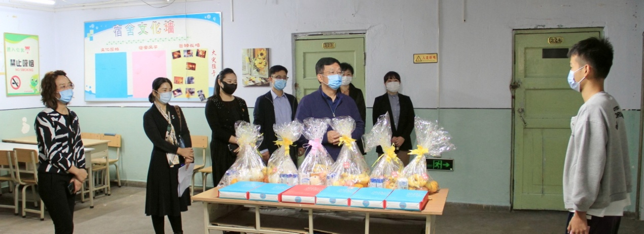 9月20日上午,副校长郭二军、学校办公室副主任王立明,学生处副处长田海燕及相关学院党委副书记一同来到校内疫情防控“居家健康监测”隔离点,看望来自国内疫情中、高风险地区所在城市进行“居家健康监测”的学生,为学生送上印有“理工味道”的专属节日大礼包,送上学校暖心的节日祝福。