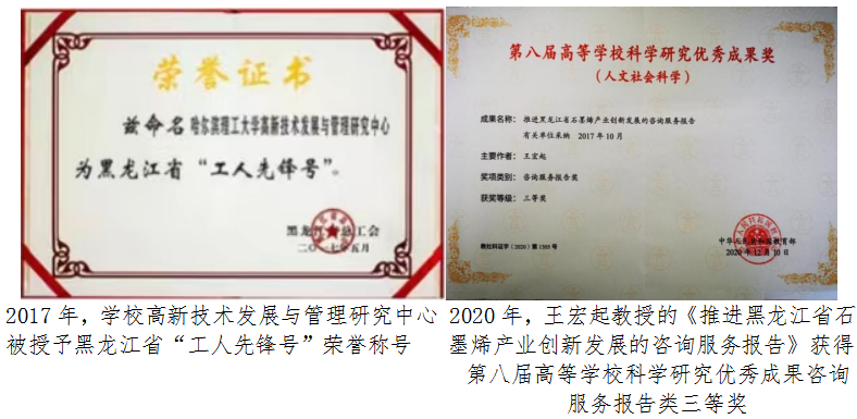 “关于加快推进我省石墨烯产业化的报告”获得省委、省政府主要领导批示。“黑龙江省人口经济与人才发展战略研究中心”进入我省重点高端智库培育。智库完成了黑龙江省人才供需数据服务智慧云平台的建设、黑龙江省重点产业对高校人才的需求分析等多项研究,形成的多篇咨询报告被黑龙江省智库专报刊载,并被报送各政府部门、事业单位传阅。“高新技术发展与管理研究中心”被授予黑龙江省“工人先锋号”荣誉称号。近五年,获批社科类国家基金13项,获教育部高校人文社科奖1项,省级人文社科奖102项,发表SSCI收录论文11篇,CSSCI收录论文256篇。