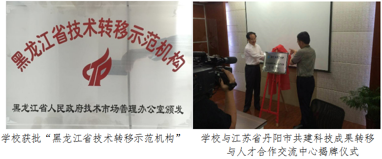 获批“黑龙江省技术转移示范机构”,连续三年获得联合考评优秀,并获政府奖励资金140万元。近五年承担企事业单位委托项目1226项,累计到款2.15亿元。与省内科技主管部门及协会联合建立了“龙江民营企业科技成果转移转化基地”“科技创新、服务龙江联合体”等科研成果转化基地。与丹阳市、无锡市等省外40余家高新技术园区和科技型企业签订了校企共建技术协议,与盐城市、贵溪市等省外地市及企业共建产业研究院2家、联合实验室5家。与省内12个地市开展了科研项目合作对接,与中国一重集团、佳木斯电机股份有限公司等省内36家知名企业建立深度产学研合作。