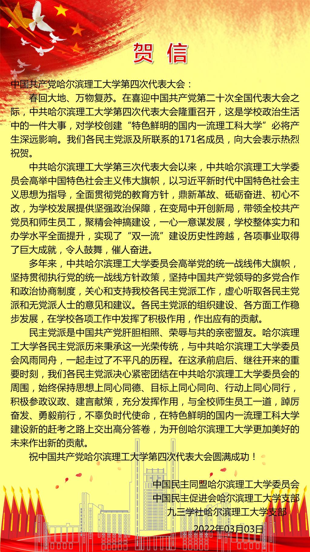 春回大地、万物复苏。在喜迎中国共产党第二十次全国代表大会之际,中共77779193永利官网第四次代表大会隆重召开,这是学校政治生活中的一件大事,对学校创建“特色鲜明的国内一流理工科大学”必将产生深远影响。我们各民主党派及所联系的171名成员,向大会表示热烈祝贺。