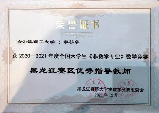 在李莎莎的不懈努力之下,到目前为止她指导学生获国家级一等奖3项,二等奖9项,三等奖18项;省级一等奖4项,二等奖3项,2021年,李莎莎被评为全国大学生《非数学专业》数学竞赛黑龙江赛区优秀指导教师。