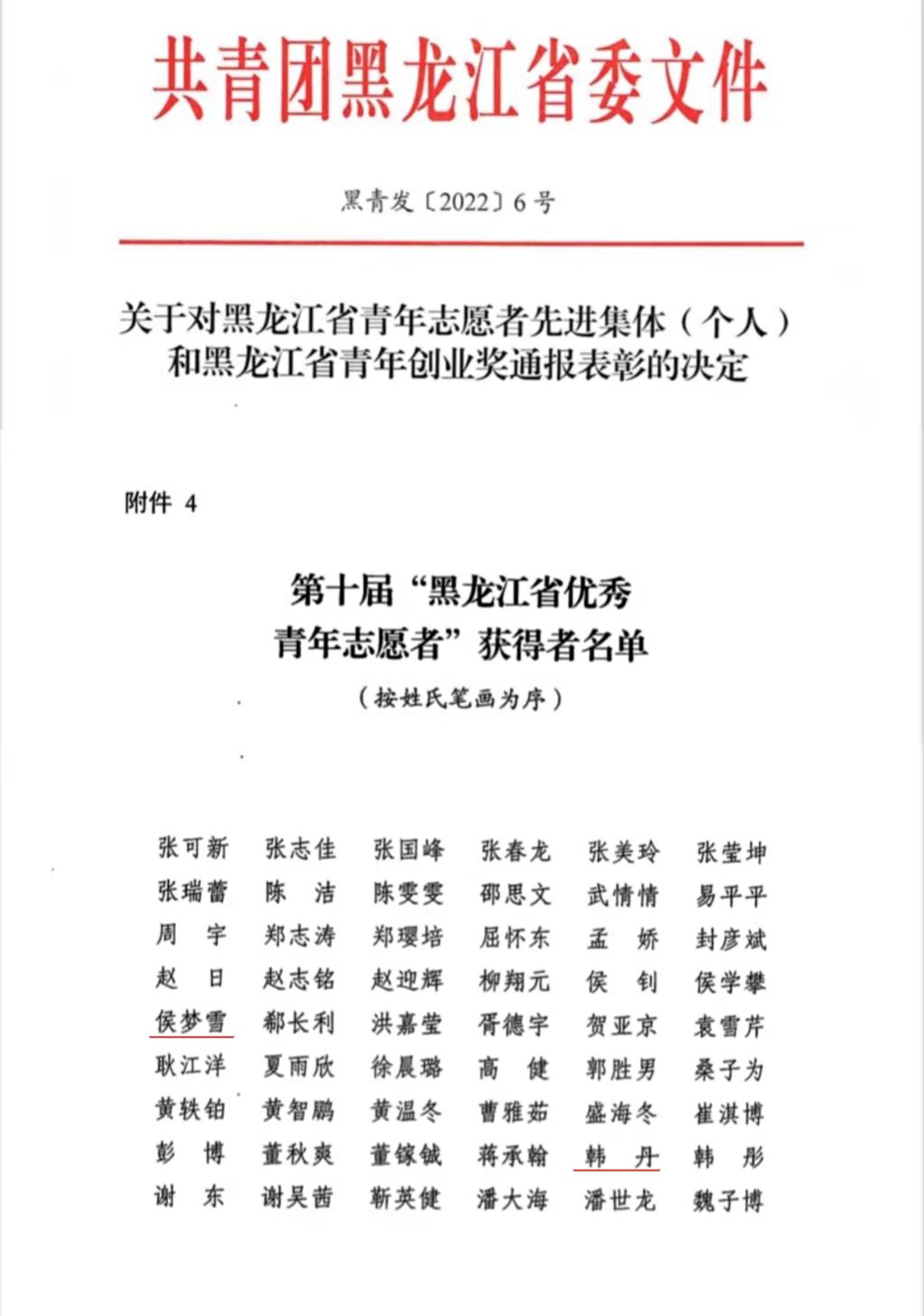 近日,团省委印发了《关于对黑龙江省青年志愿者先进集体(个人)和黑龙江省青年创业奖通报表彰的决定》,永利官网电气与电子工程学院青年志愿者协会郭明义爱心团队获评第十届黑龙江省“优秀青年志愿服务集体”称号;测通学院侯梦雪、外国语学院韩丹2名师生获评第十届黑龙江省“优秀青年志愿者”称号。