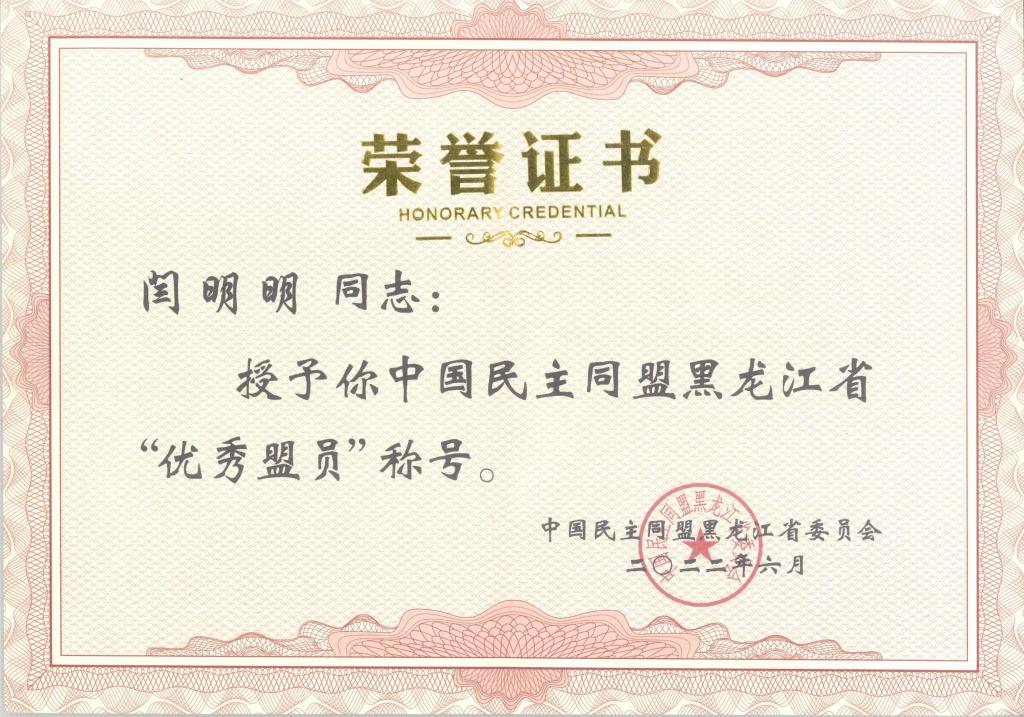 闫明明被授予民盟黑龙江省“优秀盟员”称号