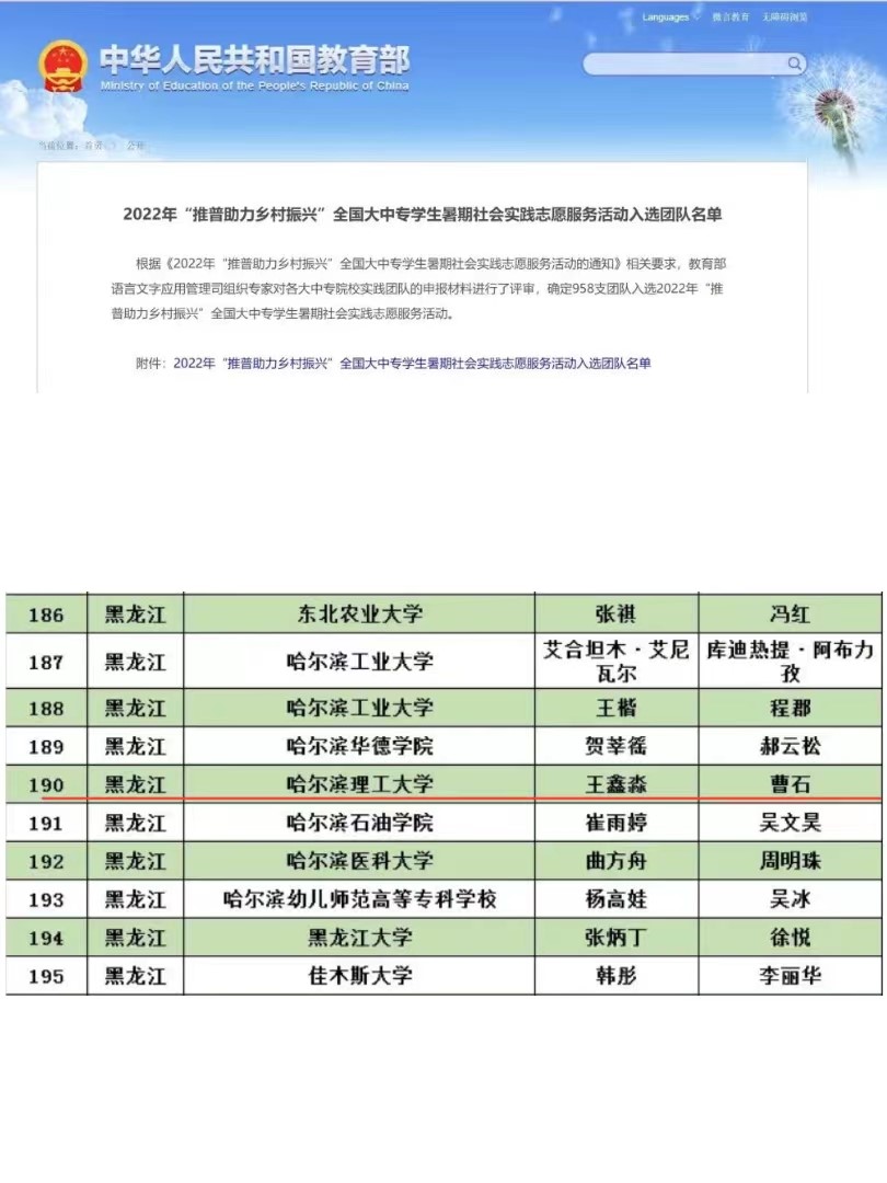 为深入贯彻习近平总书记关于教育的重要论述和关于语言文字工作的重要指示批示精神,深入学习习近平总书记在庆祝中国共产主义青年团成立100周年大会上的重要讲话精神,落实教育部、国家乡村振兴局、国家语委印发的《国家通用语言文字普及提升工程和推普助力乡村振兴计划实施方案》,加大民族地区、农村地区国家通用语言文字推广力度,铸牢中华民族共同体意识,助力乡村振兴战略实施,根据《2022年“推普助力乡村振兴”全国大中专学生暑期社会实践志愿服务活动的通知》相关要求,教育部语言文字应用管理司组织专家对各大中专院校实践团队的申报材料进行了评审,确定958支团队入选2022年“推普助力乡村振兴”全国大中专学生暑期社会实践志愿服务活动。其中,永利官网研究生支教团社会实践团队成功入选。