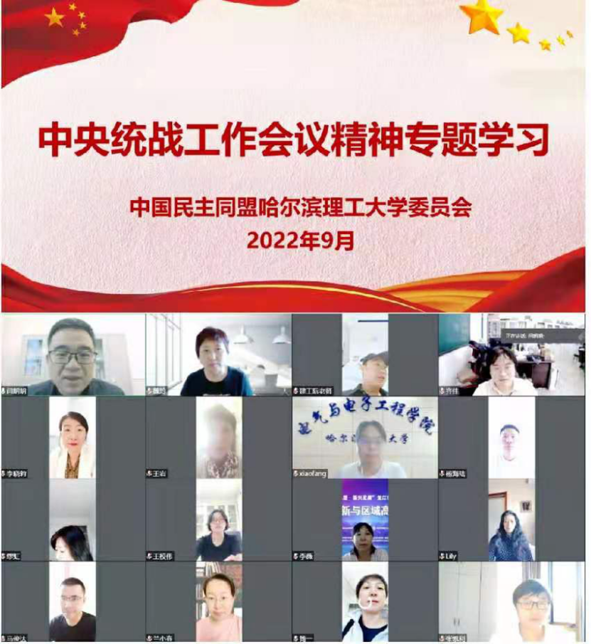 8月25日,民进哈理工支部通过召开线上学习座谈会传达学习习近平总书记在中央统战工作会议上的重要讲话精神,学习座谈会由宣传委员杨晓静主持。民进省委常委、民进哈理工支部主任委员姜毓锋在座谈会上讲话。他指出,民进哈理工支部要把学习贯彻讲话精神作为一项重要的政治任务,深刻领会“十二个必须”的核心要义,牢牢把握“三个更加重要”,正确处理“四对关系”,切实用习近平总书记关于做好新时代党的统一战线工作的重要思想武装头脑、指导实践、推进工作。会上,支部宣传委员杨晓静、会员蒋永清、魏绪涛等先后发言,表示一定要把思想和行动切实统一到会议精神上来,积极履职尽责,以丰富的形式、扎实的举措,开展参政议政、社会服务工作。