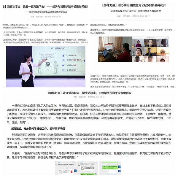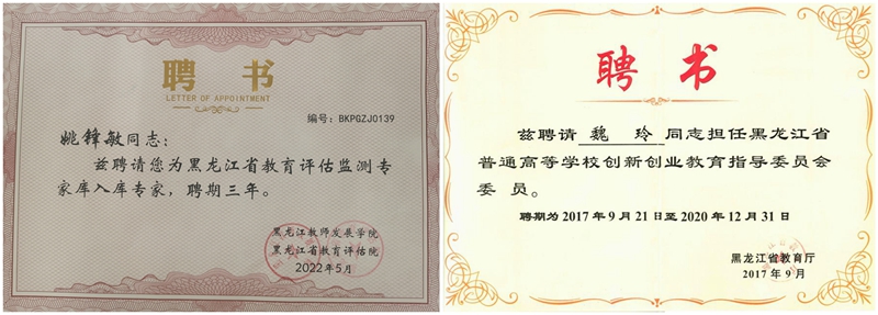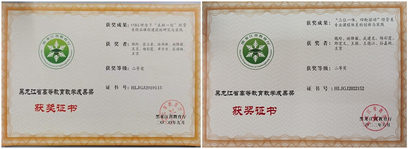 2019-2020年,魏玲、杨彩霞2名教师先后被评为黑龙江省普通高等学校创新创业教育指导委员会委员、黑龙江省电子商务职业教育教学指导委员会委员;2021年,魏玲教授被评为“黑龙江省教学名师”,实现了学院省级教学名师的突破;2022年,姚锋敏教授被评为“黑龙江省教育科学规划领导小组评审专家”“黑龙江省教育评估检测专家库入库专家”,同年,姚锋敏教授作为主要执笔人,协助教育厅完成了《黑龙江省普通高等学校商科教育改革创新实施方案》,为我省打造“新思维+新技术+新模式+新服务”的商科教育新格局贡献智慧和力量。