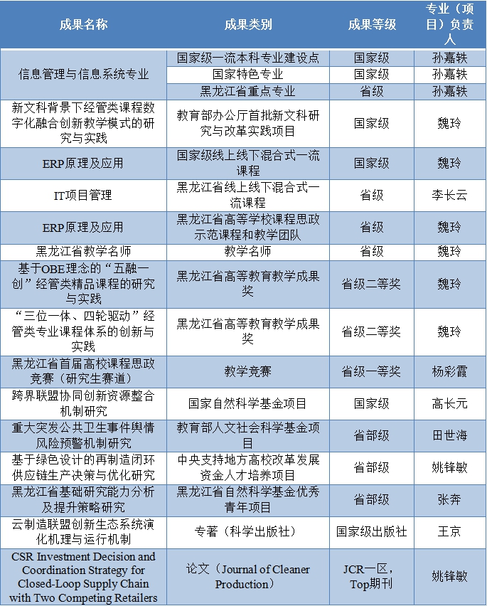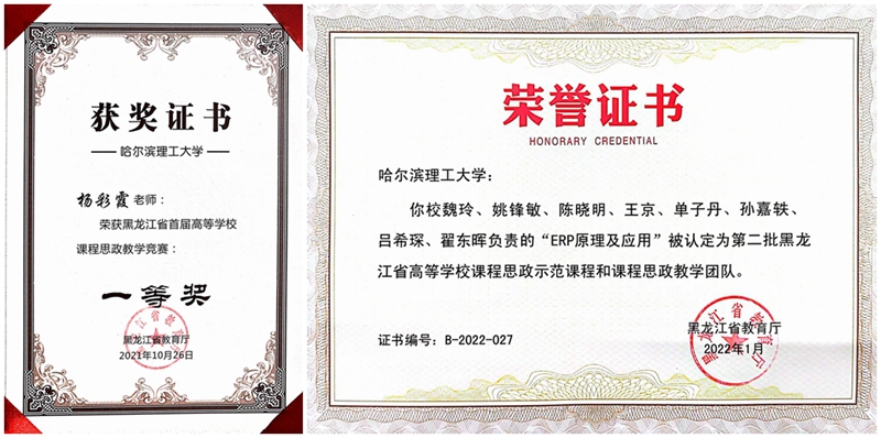 今年年初,黑龙江省教育厅公布第二批黑龙江省高等学校课程思政示范项目名单,永利官网经济与管理学院信息管理与信息系统系申报的“ERP原理及应用”课程思政示范课程和教学团队被认定为黑龙江省高等学校课程思政示范课程和教学团队;信管系专业骨干教师主持及参与完成的教研项目分别获评2020、2022年“黑龙江省高等教育教学成果”一等奖、二等奖各2项,一流本科专业建设再创新佳绩。