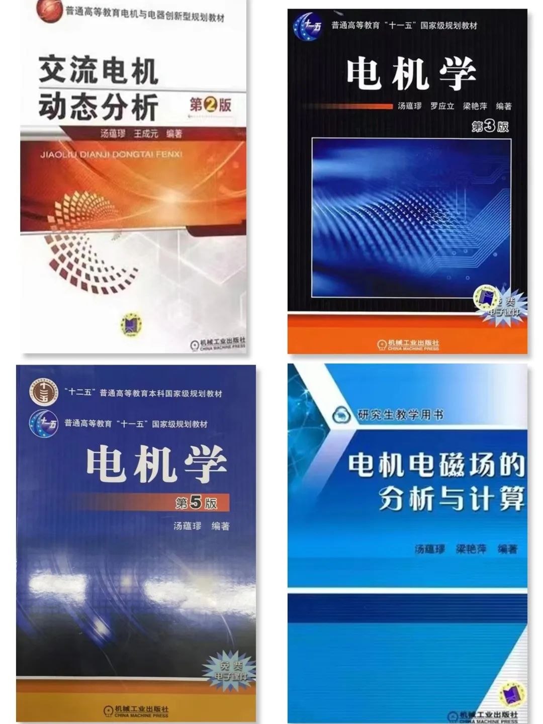 汤蕴璆教授学术造诣深厚,教学成果丰富。编著有《电机内的电磁场》《电机理论与运行》《电机学—机电能量转换》《交流电机动态分析》《电机学》等10余本著作,其中编著的《电机学》为“九五”国家级重点教材、面向21世纪课程教材、“十五”国家级规划教材以及“十一五”国家级规划教材。主持完成“七五”国家科技攻关项目、国家自然科学基金项目及企业委托项目等研究工作。在国内外学术刊物和国际会议上发表论文60多篇,扩大了我国电机电磁场研究工作在国际上的影响力。