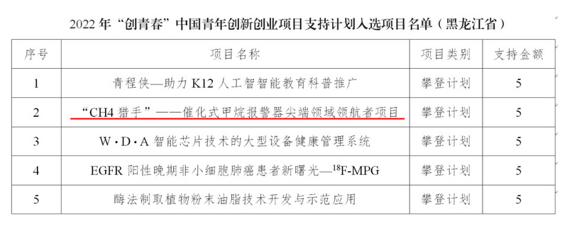 近日,由共青团中央主办的2022年“创青春”中国青年创新创业项目支持计划公布入选项目名单,永利官网测控技术与通信工程学院教师孙慧、邬长明指导的项目《“CH4猎手”——催化式甲烷报警器尖端领域领航者》成功入选科技创新“攀登计划”类项目,获5万元资助,黑龙江省仅5项入选。