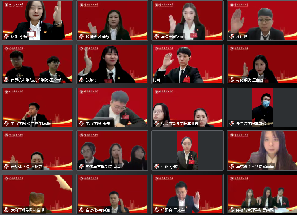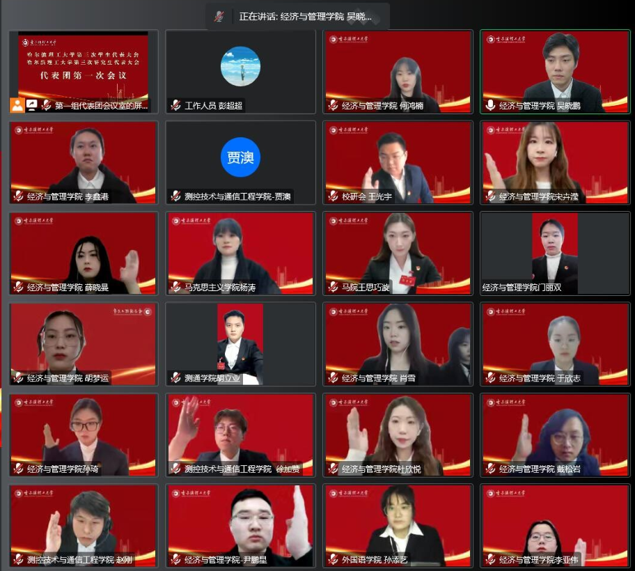 11月20日上午9时,在雄壮的国歌声中,77779193永利官网第三次学生代表大会暨第三次研究生代表大会在线上开幕。黑龙江省驻会主席黄亚南、哈尔滨工程大学学生会主席王浩屹、校团委副书记曹石、校团委组织建设部负责人张奇、各学院团委书记,各学院学生会、研究生会指导教师列席会议。开幕式由校学生会指导教师李晟睿主持,526名代表表肩负着广大青年学生的重托,担负着青春梦、强校梦、中国梦的青春使命与担当,满怀着憧憬、喜悦与激动出席大会,青春相聚,回顾过往,共话未来。