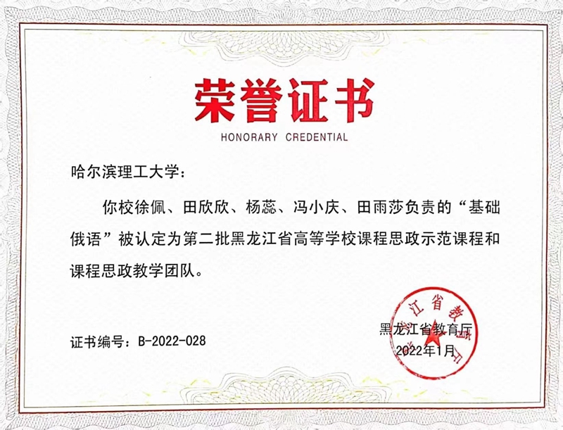 课程建设结硕果。2021年“基础俄语”获黑龙江省线上线下混合式一流本科课程、黑龙江省课程思政示范课;2022年“俄语语义学”获黑龙江省研究生课程思政示范课,优秀课程案例,“俄罗斯文学流派”获批校级研究生精品课。