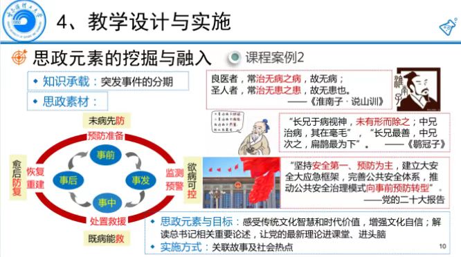 《安全与应急管理》是面向安全学科研究生开设的一门学科学位课,获批黑龙江省课程思政案例建设项目。该课程以“思政”与“专业”相长为原则,以“培养安全与应急领域急需的管理及科研人才,助建平安城市,助力平安中国”为课程思政主题,探索总结出了“一主线三环节四结构”的课程思政建设路径,并构建了包含“四个结构”的课程思政案例库,以实现“政治性与学理性”、“理论性与实践性”、“学术性与趣味性”相统一的课程建设目标。