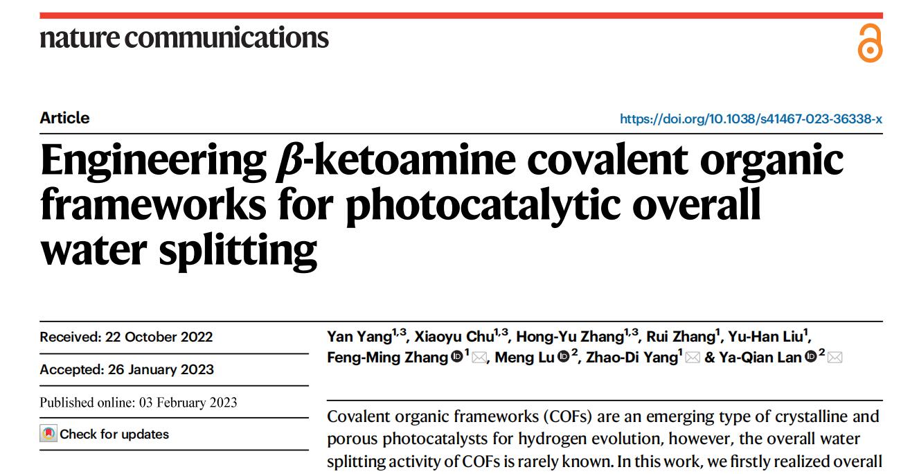 近日,材料科学与化学工程学院张凤鸣教授团队科研成果在期刊Nature Communications上发表,论文题目为Engineering β-ketoamine covalent organic frameworks for photocatalytic overall water splitting (论文链接:https://www.nature.com/articles/s41467-023-36338-x),永利官网为第一完成单位。Nature Communications是Nature出版集团旗下的国际顶级综合性学术期刊,影响因子为17.694。