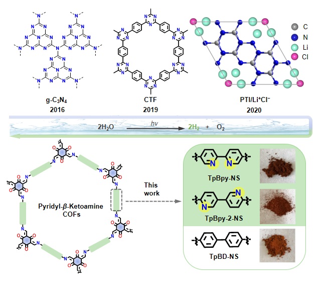 氢能具有能量密度高、绿色无污染等优点是理想的能源载体,利用太阳能在催化剂的作用下将水分解为氢气和氧气是获取氢能的绿色方式。共价有机框架(COFs)作为一类具有晶态多孔结构和可见光响应的新型光催化剂,已经表现出了在牺牲剂存在下优良的可见光催化产氢活性,但是这些COFs材料仅能驱动产氢或产氧半反应,全分解水同时产氢、产氧COFs催化剂的构筑方法尚不清楚。针对此问题,张凤鸣教授团队设计了一系列具有相同框架结构的β-酮胺COFs作为模型体系,通过在结构中构筑N位点、调控COFs形貌和Pt纳米粒分布区,首次实现了β-酮胺COFs光催化剂全分解水产氢、产氧,其STH效率达到0.23%。并通过实验与理论计算结合,进一步揭示了β-酮胺COFs中产氢的活性中心在Tp端的O位点,析氧中心位于吡啶环的C位点,N位点不同位置导致光生电子转移效率以及产氧位点活性方面的差别,使材料表现出不同的全分解水活性。该研究首次提出了β-酮胺COFs全分解水性能的构筑策略,具有广泛的普适性,对COFs全解水催化剂的设计和制备具有重要的指导意义。