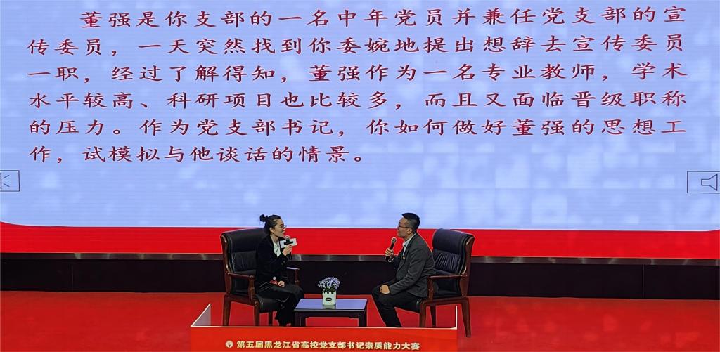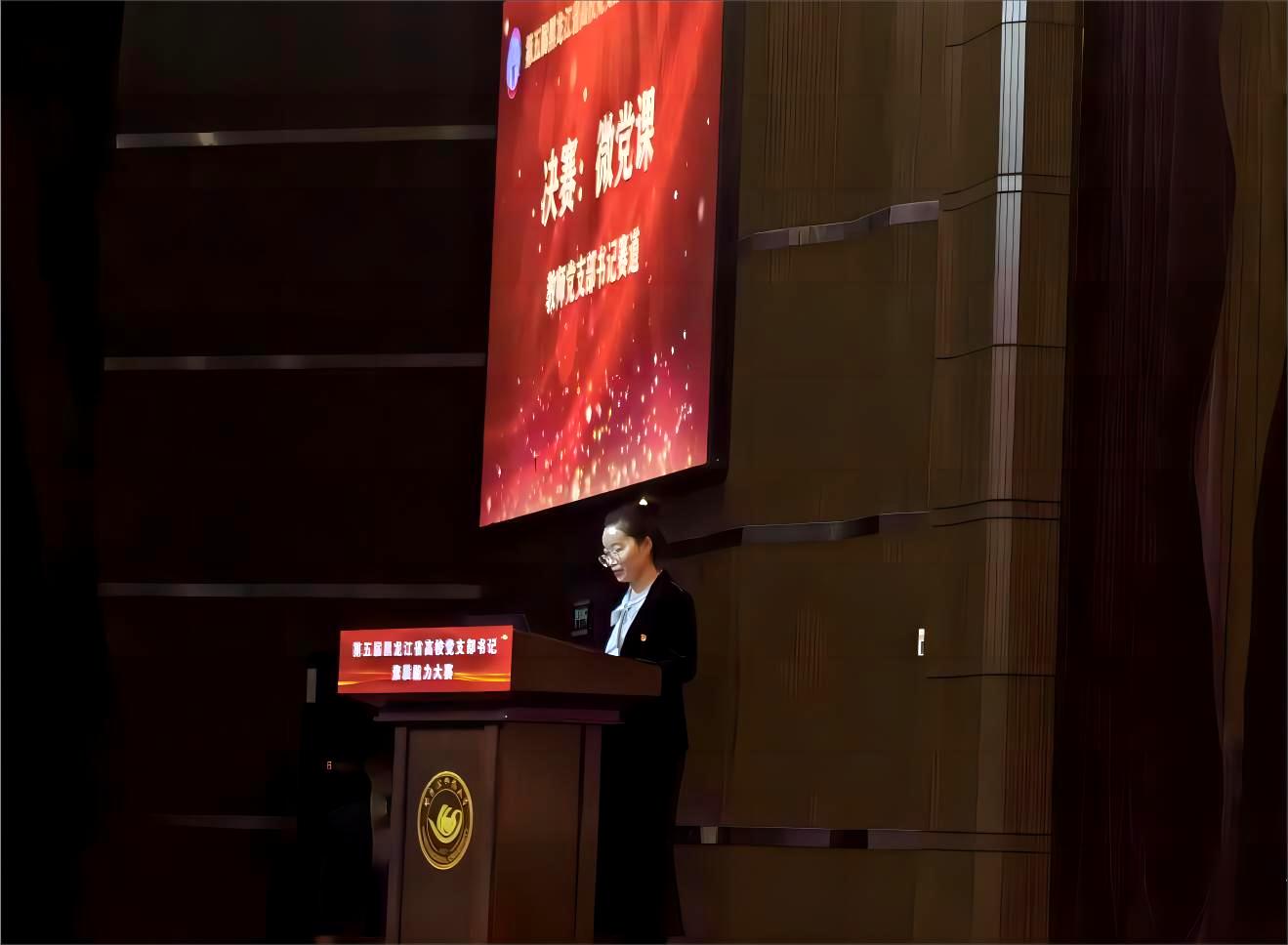 4月19日,黑龙江省第五届高校党支部书记素质能力大赛落下帷幕,永利官网电机电器及其控制系党支部书记汪冬梅老师荣获二等奖,这也是该项赛事举办以来永利官网取得的最好成绩。学校党委副书记郭加利带队到现场观摩比赛,党委常委、组织部部长赵水杉作为评委嘉宾应邀出席大赛,全校基层党组织书记和党务工作者通过网络直播在线观看决赛实况。