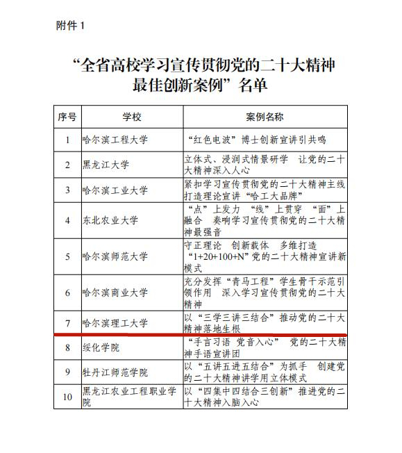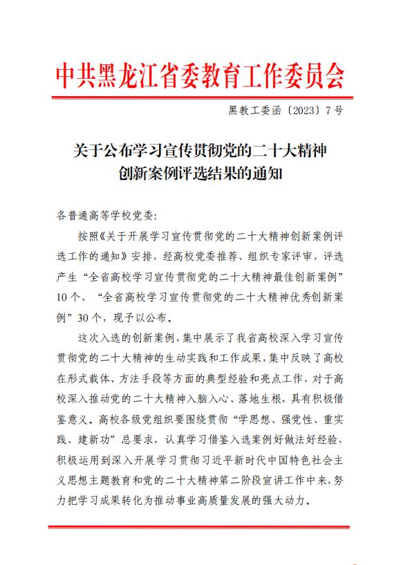 本次学习宣传贯彻党的二十大精神创新案例评选,是由省委教育工委组织开展,经高校党委推荐、组织专家评审,评选产生了“全省高校学习宣传贯彻党的二十大精神最佳创新案例”10个、“全省高校学习宣传贯彻党的二十大精神优秀创新案例”30个。自党的二十大胜利召开以来,学校党委高度重视党的二十大精神学习宣传贯彻,着力推动“第一时间”跟进学、“示范带动”规范学、“融入课堂”深入学;着力开展高位推动覆盖讲、上下贯通融合讲、先优典型特色讲;着力与提能力、转作风相结合、与推行“马上就办”相结合、与“引育留用”一体推进的人才工作格局相结合,助力龙江全面振兴全方位振兴,展示了永利官网在深入推动党的二十大精神入脑入心、落地生根的生动实践、亮点工作和典型经验,为深入学习贯彻党的二十大精神提供了积极借鉴。