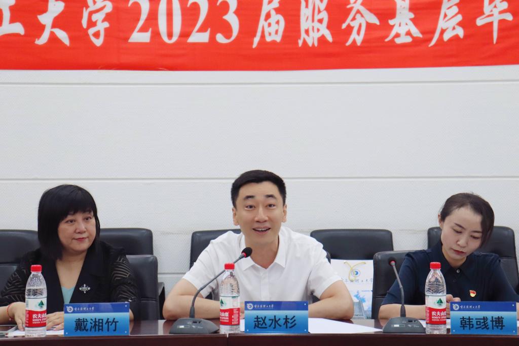 赵水杉为全体出征同学讲授了一堂生动的主题教育微党课。他指出,在扎实推进学习贯彻习近平新时代中国特色社会主义思想主题教育走深走实过程中,又一批服务基层的毕业生投入到基层治理现代化的火热实践中。学校党委高度重视服务基层毕业生工作,持续完善选拔、培养、输送和跟踪管理全链条培养机制,培养输送了一批政治素质硬、业务能力强的基层优秀人才。同学们出征在即,请大家始终坚持用习近平新时代中国特色社会主义思想武装头脑,树立崇高的理想、练就过硬的本领、培育浓厚的家国情怀、投身火热的社会实践,通过研究生支教为服务人才强国和西部大开发战略发挥积极作用;通过西部计划项目,服务乡村振兴和边疆建设;通过选调到基层工作,适应基层艰苦环境,锻炼自身能力水平;通过应征入伍,到军队中淬炼钢铁意志,服务现代化国防建设。他对即将踏上新征程的同学们提出三点希望:一是坚持党的全面领导,胸怀国之大者,树立鸿鹄之志;二是牢记学校殷切嘱托,赓续大珩精神,开展生动实践;三是提升服务基层意识,练就过硬本领,勇担时代使命。在全面建设社会主义现代化国家的伟大征程中,做一颗闪耀的理工“珩星”。