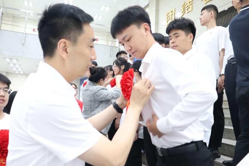随后,赵水杉为第25届研支团代表、西部计划志愿者代表、服务基层选调生代表以及应征入伍代表分别授旗,领导老师为全体出征同学佩戴光荣之花。在研支团队长宁宇晗的带领下,全体服务基层同学庄严宣誓。最后,领导老师为出征同学赠送纪念品并合影留念。