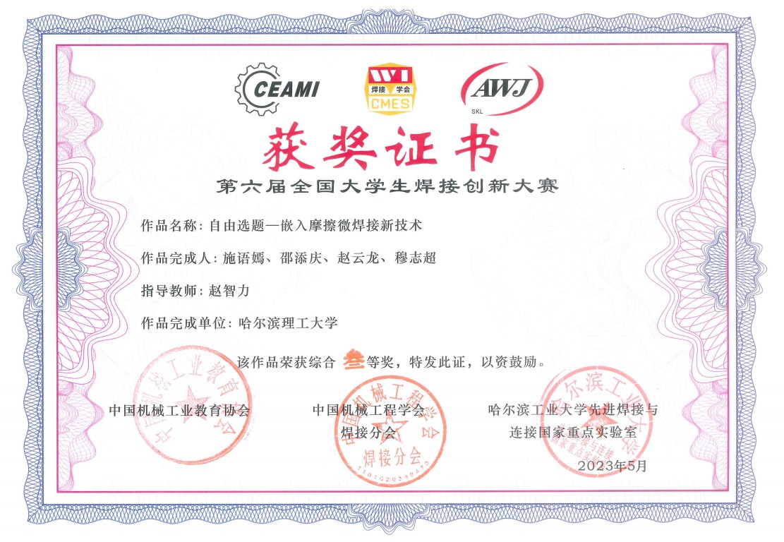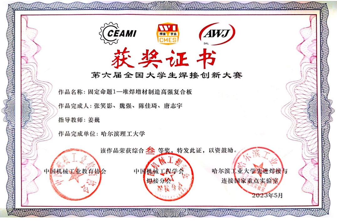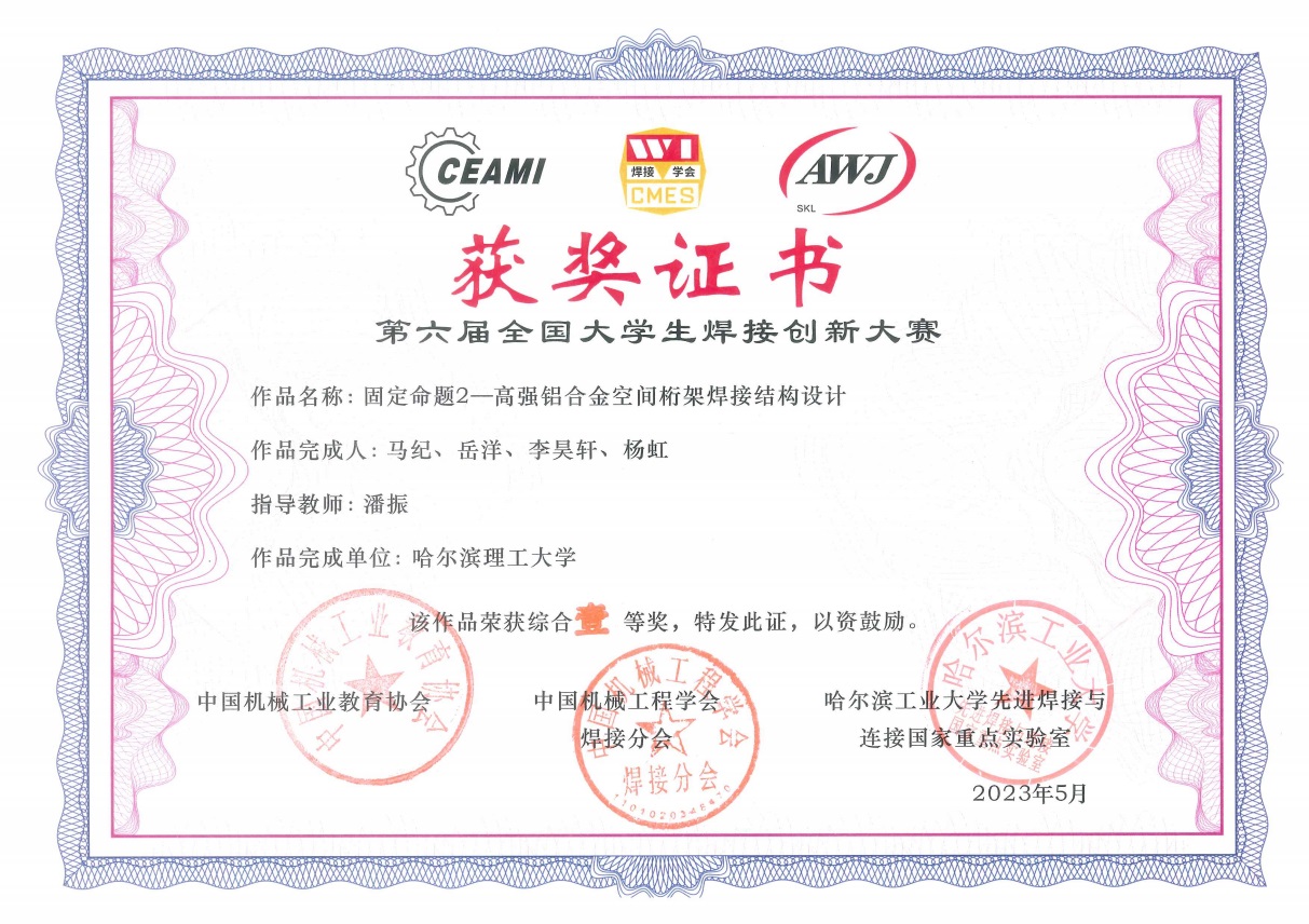 近日,第六届全国大学生焊接创新大赛暨第四届焊接技术与工程专业委员会成立大会在河南科技大学举行。中国机械工业教育协会理事长王守法,中国机械工程学会焊接分会副理事长巩水利,中国机械工业教育协会焊接技术与工程委员会主任委员方洪渊、先进焊接与连接国家重点实验室副主任黄永宪等出席开幕式。永利官网参赛队伍经过校内选拔和大赛组委会初评,最终材化学院材型系3支队伍参加全国总决赛。其中潘振老师的指导的马纪、岳洋、李昊轩、杨虹四位同学组成的代表队荣获大赛一等奖,姜巍老师指导的张笑影、魏强、陈佳琦、唐志宇代表队,赵智力老师指导的施语嫣、邵添庆、赵云龙、穆志超代表队荣获大赛三等奖。