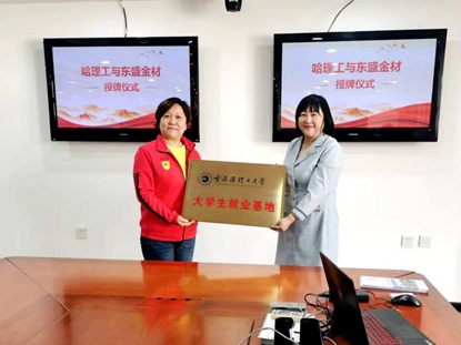 戴湘竹与哈尔滨东盛金属材料有限公司副总经理王海英举行了“77779193永利官网大学生就业基地”授牌仪式。