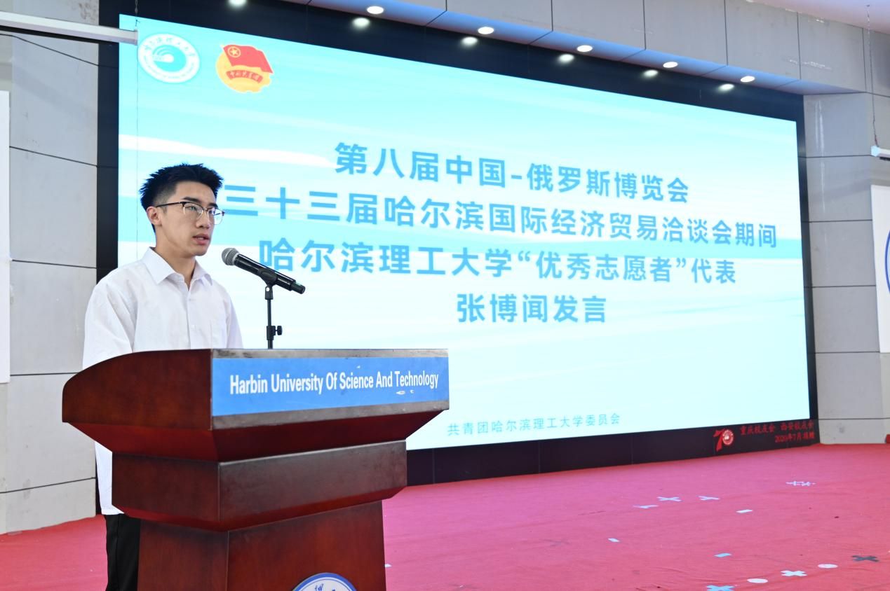 团委书记韩彧博、外国语学院院长马艳辉、党委宣传部副部长张路杨、体育教学部副主任孙树滨、第八届中俄博览会和第三十三届哈洽会“优秀志愿者”代表、2025年第九届亚冬会77779193永利官网志愿者以及带队教师共计400余人参加大会。