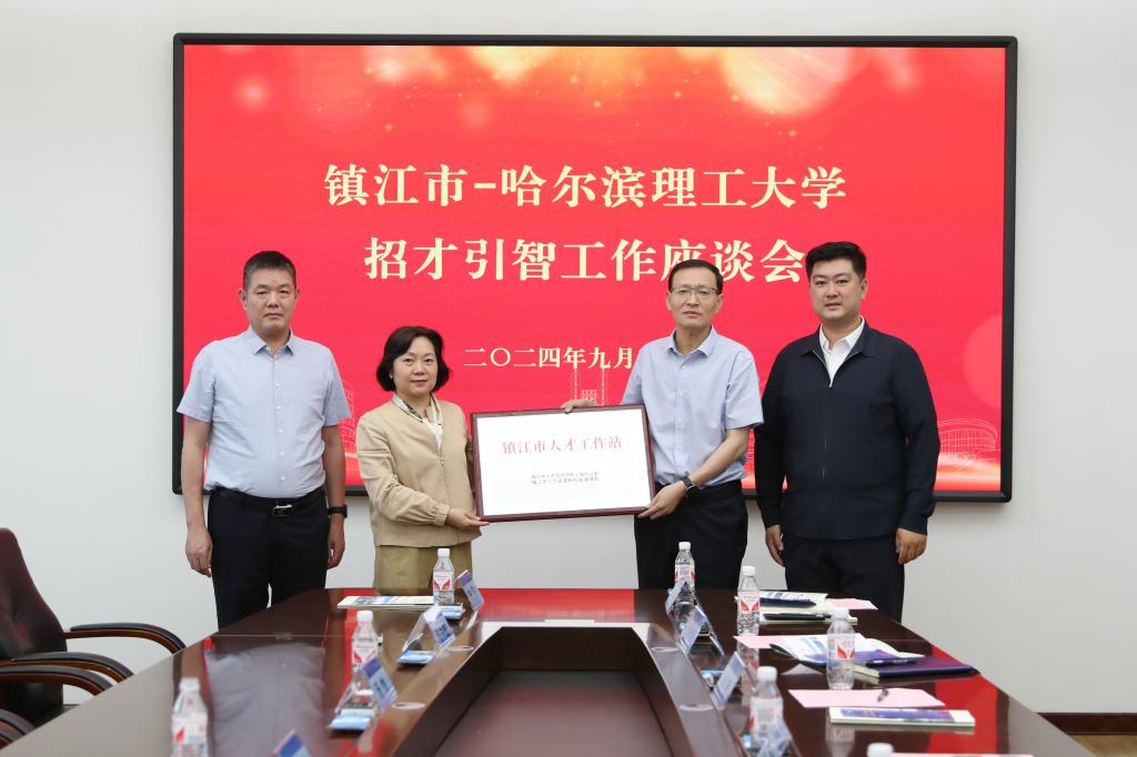 在工作座谈会上,郭加利致辞,对镇江市一直以来对学校的关注和支持表示感谢,张娟对镇江市进行了推介。镇江市委组织部常务副部长匡文虎,市人社局党委书记、局长艾晓晖分别介绍了“金山英才”计划和大学生政策,学校相关部门和学院结合所负责工作进行了交流。双方还举行了“镇江市人才工作站”授牌仪式。