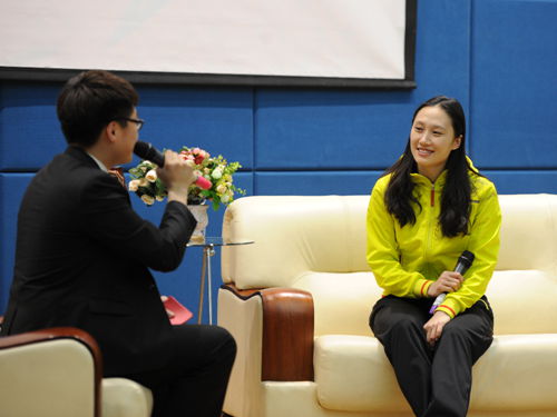 在主持人访谈环节,张虹校友讲述了冬奥会夺冠经历及个人成长的历程。在索契冬奥会比赛中,张虹校友身上带着老伤,又患有感冒,她独自承受着压力,从未放弃。一位25岁的年轻姑娘,肩上承担着祖国人民的殷切期望,因为梦想、因为信念,她没有被困难击退,她一直在坚持并努力拼搏。她回忆说,当冲过终点线的那一刻,她就知道自己胜利了,这样的胜利并非意味着超过了其他选手,而是成功超越了自己,无论结果如何,自己都问心无愧。张虹校友的一句“只有把自己做好,才能对得起为我加油的人”感动了在场所有的观众。赛场是残酷的,张虹校友领先亚军0.6秒,这0.6秒对于常人来说可能是极其微小的,然而对于速滑运动员来说却有着本质上的区别。